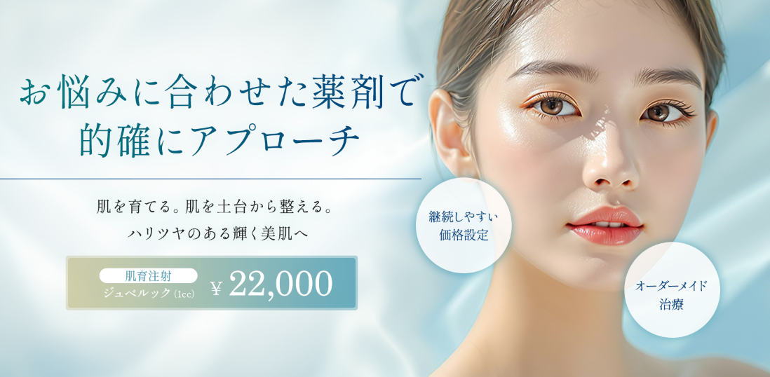 当院の肌育注射は、豊富な製剤ラインナップからお悩みに合わせて医師が選ぶオーダーメイド方式。ハリ・毛穴の引き締めにはジュベルック、くすみ・ニキビ跡にはプルリアル、目元のクマ・小じわにはジャルプロ ヤングアイなど、複数の悩みを抱えている方でもカウンセリングで最適なプランをご提案いたします。注入方法も、顔全体を均一にケアする「機械打ち」と気になる部分をピンポイントで狙う「手打ち」からお選びいただけます。